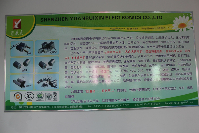 深圳市圓睿鑫電子有限公司自2008年創(chuàng)立以來,經(jīng)過誠信耕耘,在為期兩年的時(shí)間內(nèi),已通過ISO9001:2000國際質(zhì)量體系認(rèn)證。公司廠房占地面積2000多平方米,員工100人,專業(yè)技術(shù)工程師6名,擁有國內(nèi)最先進(jìn)的生產(chǎn)和檢測設(shè)備,年產(chǎn)各類減速電機(jī)超過2~300萬臺。因公司發(fā)展需要,于2020年底,將生產(chǎn)基地遷往擁有最美小鎮(zhèn)之稱的東莞市清溪鎮(zhèn),依山傍水,依托美麗的大自然環(huán)境和地方文化,全新的東莞市圓睿鑫電子有限公司將借助深圳母公司平臺,一步步走上新的臺階。 東莞公司將繼續(xù)致力于生產(chǎn)銷售各類無刷減速電機(jī) 渦輪渦桿電機(jī),微型減速電機(jī),直流減速馬達(dá),交流手搖發(fā)電機(jī)、同步電機(jī)及空心杯電機(jī)等,電機(jī)直徑從6-60毫米為定位,系列產(chǎn)品廣泛用于智能家電、智能辦公自動化設(shè)備、智能醫(yī)療、美容健身器材、遙控模型、電動工具、高檔玩具以及其它工業(yè)驅(qū)動裝置,如高檔玩具、游戲機(jī)、麻將機(jī)、飄香器、手機(jī)發(fā)電機(jī)、柔巾機(jī)、自動噴霧器、汽車自動設(shè)施、電動牙刷、舞臺燈飾、圣誕產(chǎn)品、智能電子門鎖、VCD、DVD、水泵、氣泵、水表、煤氣閥、電磁閥、攪拌機(jī)、榨汁...